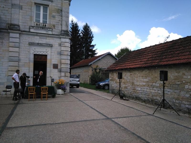 Sonorisation de la cérémonie de mariage avec une sono portable sur pied de 250W RMS devant la mairie de Chamblay.